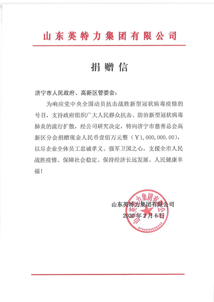 自新型冠狀肺炎疫情爆發(fā)以來,一向牽動(dòng)著英特力人的心。2月6日山東英特力集團(tuán)有限公司特向濟(jì)寧市慈善總會(huì)高新區(qū)分會(huì)捐贈(zèng)現(xiàn)金人民幣壹佰萬元整(¥1,000,000.00),以盡企業(yè)全體員工忠誠(chéng)孝義、強(qiáng)軍衛(wèi)國(guó)之心,支援全市人民克服疫情、保障社會(huì)穩(wěn)固、人民健康幸福! 眾擎易舉、共克時(shí)艱。在黨中間、各級(jí)當(dāng)局同一頑強(qiáng)的向?qū)拢⑻亓θ藢⒗^承積極自動(dòng)承擔(dān)起同舟共濟(jì)的社會(huì)責(zé)任,與全國(guó)人民一路齊心協(xié)力打贏這場(chǎng)疫情防控戰(zhàn)。 |